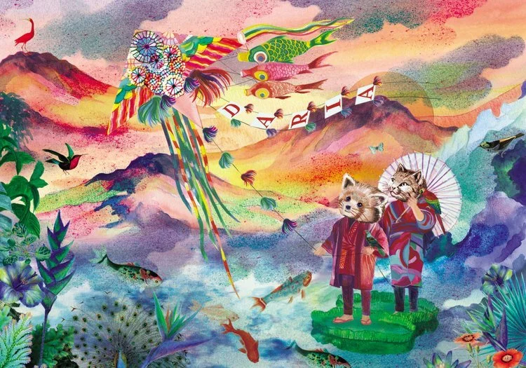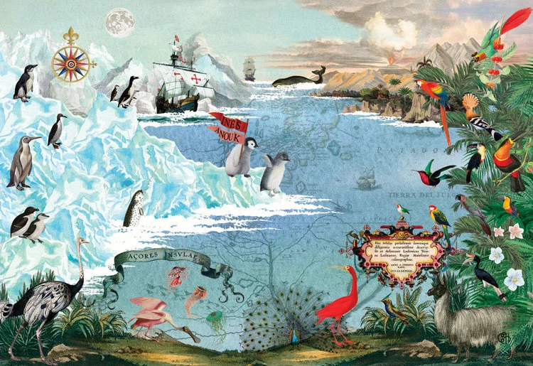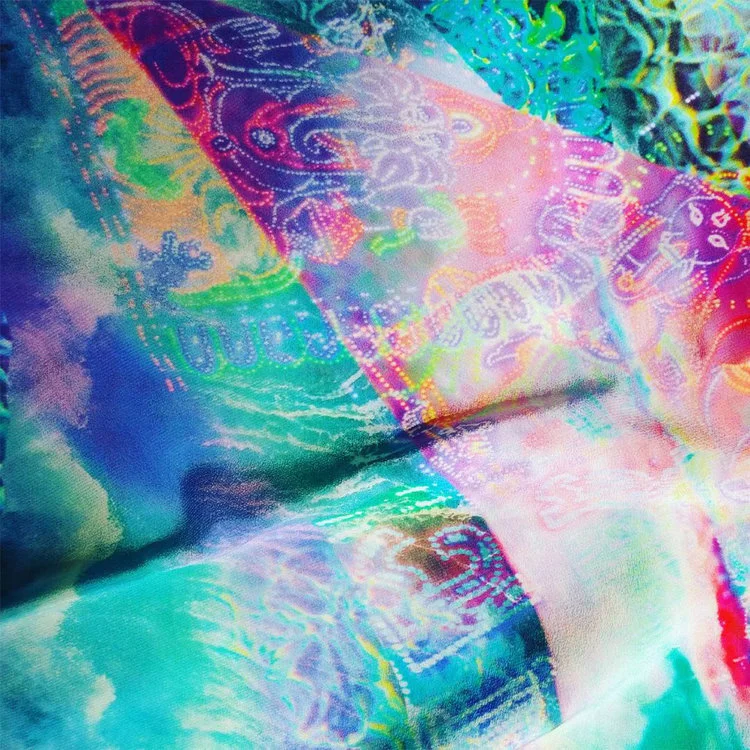 Clémentine Henrion's first silk scarves collection, Ein Stein On The Beach, was inspired by Allen Ginsberg's poem On Cremation Of Chögyam Trungpa Vidyadhara, whose words open a pathway between earth and sky, visions and sensations. Each creation was inspired by stories of extraordinary journeys and explorations of the earth's wonders and meant to feel like a night flight above beautiful landscapes. The scarves' asymmetrical compositions invite one's gaze to dive in and contemplate each detail to gather the coherence of the whole. The scarves are no longer silk squares, but a finery, aimed to adorn the wearer with the beauty and powers of the (super) natural world.
