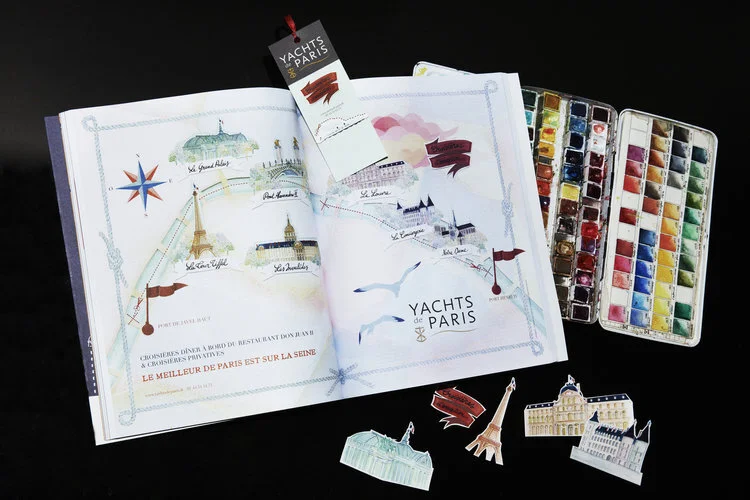 Playful illustration with assorted bookmark for Yachts de Paris advertisement, published in Guide Fooding